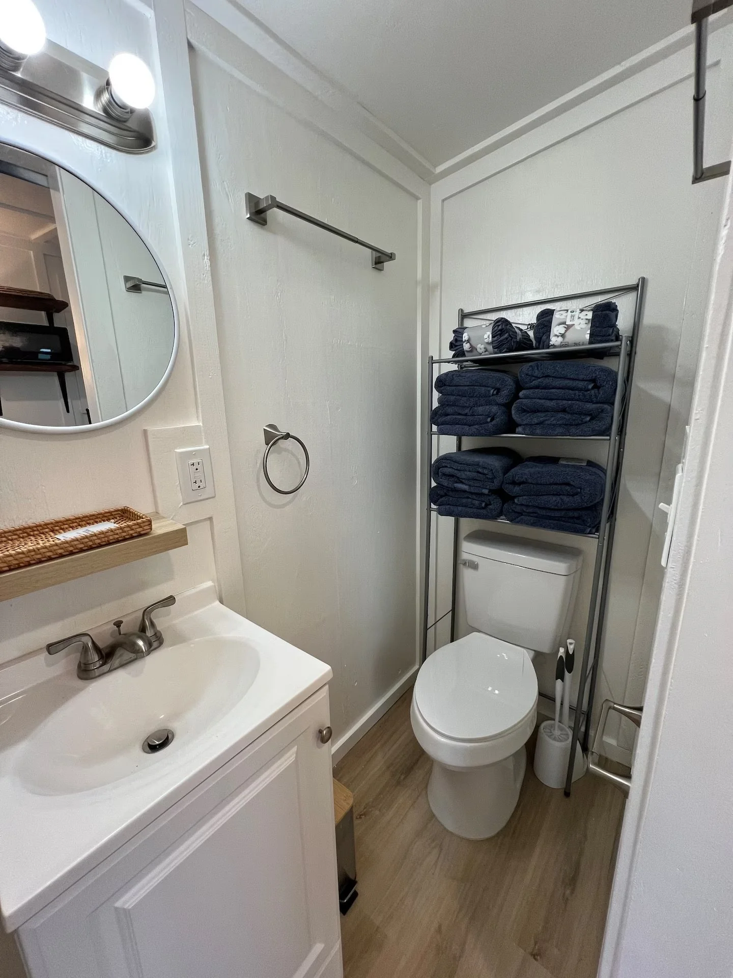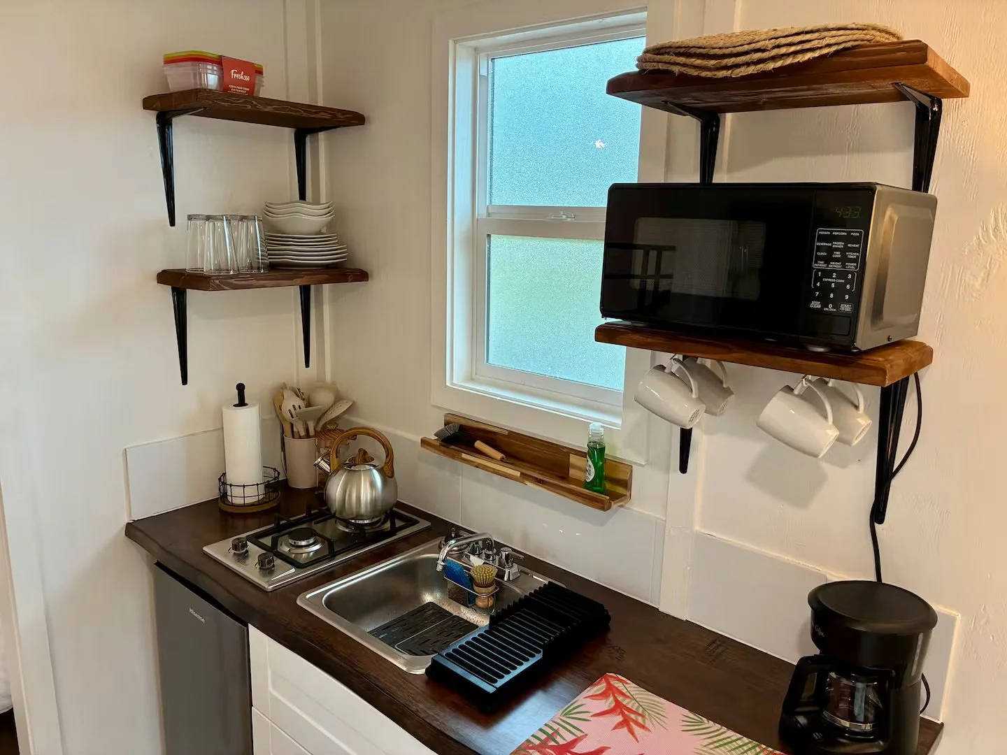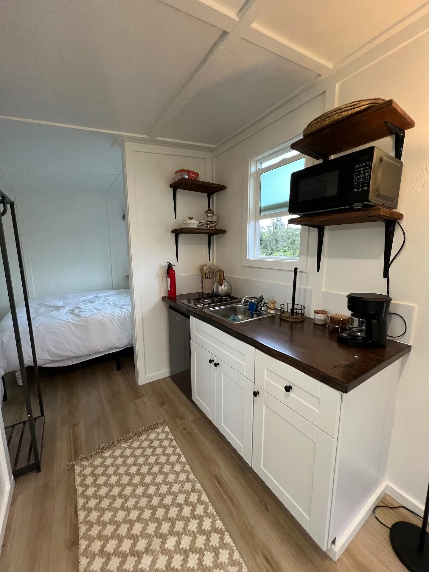 Featuring a queen-size bed in a snug bedroom, a fully stocked kitchenette with a mini-fridge, gas stove, coffee maker, sink, and all the cooking utensils and spices you’ll need to whip up a quick meal. Two dining chairs and a table are the perfect spot to sip tea while watching the sunrise. The bathroom includes a standard shower, toilet, and sink.